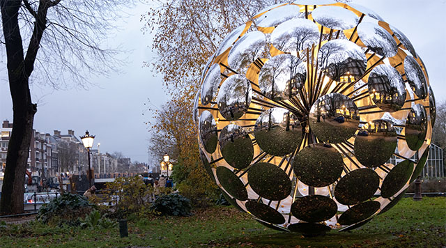 In het water bij de Hortus staat Orb – het is of lijkt gemaakt uit spionnetjes, de spiegeltjes die onze grootouders soms bij het raam hadden hangen om te zien wie er voor de deur stond. Nog op de Nieuwe Herengracht, naast het H’ART museum, staat een werk met de naam O.T 1407. De associatie met morsecodes popt op. Het zijn verticale buizen die steeds van kleur veranderen.