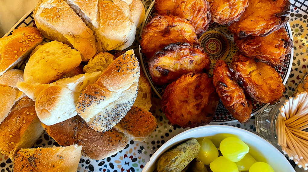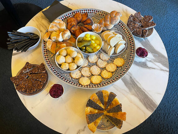 Er zijn 24 couverts voorbereid (twee glazen per persoon flessen water op tafel) en in het midden van de Eggertzaal – de ruimte boven het café van De Nieuwe Kerk – staan twee tafels met deels bekende en deels nog onbekende hapjes. De eerste deelnemer is een dame op leeftijd die na het zien van de documentaire Nesjomme (2025) werd getriggerd. Ook leest ze de columns van Natasja van Weezel en kijkt naar Eva in de vroege avond waar vaak het conflict in het Midden-Oosten ter sprake komt. ‘We moeten nou niet doen alsof de hele Nederlandse bevolking de Joodse gemeenschap omarmt’, zegt ze. De tentoonstelling Mokum heeft ze nog niet gezien, maar omdat het vandaag ook verkiezingsdag is en de kerk stembureau, kan ze die vandaag nog gratis zien.