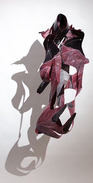‘In mijn werk staat de vrouw centraal, als drager van zowel persoonlijke als koloniale geschiedenis’, licht Nynke Deinema toe. ‘De witte kebaya fotografeer ik in verschillende posities waarna ik de beelden bewerk door te krassen, perforeren en in te wrijven met pastel. Hieruit ontstaan mobielen en bewerkte fotowerken. Deze werkwijze noem ik iconoclasme – beeldenstorm. De werken zijn zacht en tastbaar, maar tegelijk geschonden: een reflectie op de gelaagde erfenis van het koloniale verleden.’