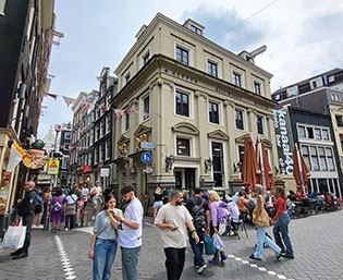 De bouw van stadhuis en opera op het Waterlooplein – de Stopera – was destijds zeer omstreden; het complex werd in 1986 geopend. We wandelen om het stadhuis heen en slaan linksaf bij het beeld van de beroemde filosoof en vrijdenker Spinoza. De sokkel blijkt een prima zitplaats te zijn voor toeristen die mijmeren, iets doen op hun telefoon of uitkijken over de Zwanenburgwal en de Amstel. De spreuk ‘Het doel van de staat is de vrijheid’ op de sokkel wordt een beetje toegedekt, maar men zit hier in alle vrijheid te genieten van een mooi dagje Amsterdam. Doel bereikt, zeg maar.