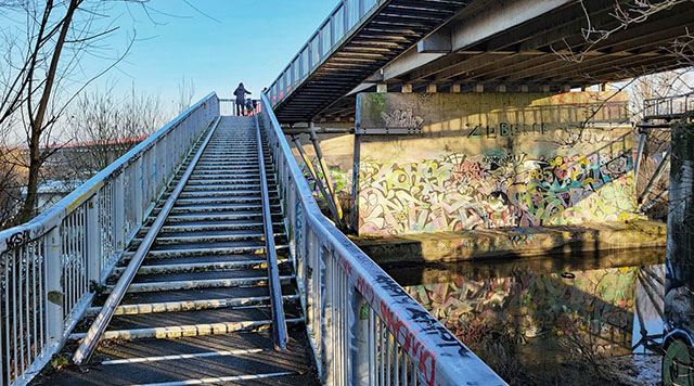 We lopen verder en kijken uit over de binnenbaai die is ontstaan door de aanleg van de eilanden van IJburg. Vlak na villa Zomerlust landt de Nesciobrug op de Diemerzeedijk. De ranke brug is een belangrijke fietsverbinding van IJburg met de rest van de stad. Vorig jaar is het kruispunt aangepakt en veiliger gemaakt, zodat fietsers – die met nogal een vaart van de brug afkomen – vaart moeten minderen en minder kans lopen met voetgangers of andere fietsers die dwars daarop rijden in botsing te komen. Voor voetgangers is een klein vluchtheuveltje gemaakt. Een goede ingreep.