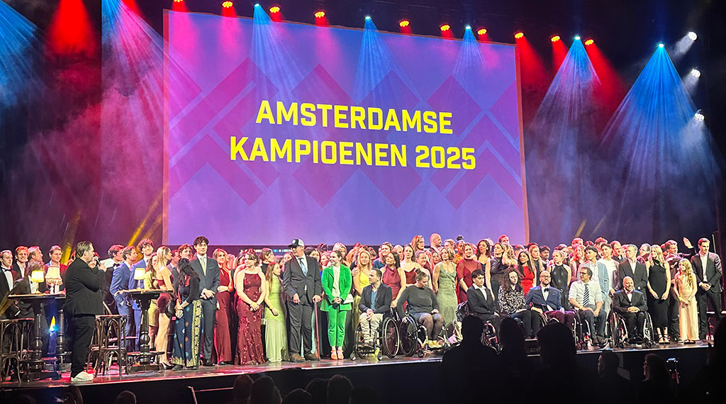 Wethouder Sport Sofyan Mbarki sprak de volle zaal toe. ‘Jullie Amsterdamse kampioenen zijn helden’ zei hij. ‘Succes moet je vieren.’ Volgens Mbarki liet 2025 opnieuw zien hoe sterk de band tussen de stad en sport blijft. ‘Amsterdam en sport vormen een gelukkig huwelijk.’