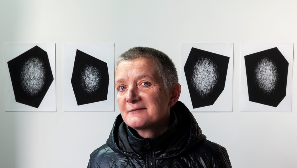 Manja werkt na al die jaren nog steeds met Siberisch krijt, maar haar tekeningen zijn gaandeweg abstract geworden. Het gros bestaat uit strak afgebakende vormen met een rafelig hart: ‘Ik zie de resultaten als zelfportretten. Niet letterlijk, maar wel qua karakter: soms zwaarmoedig, maar meestal vrolijk. En zwart natuurlijk, net als mijn kleding dat nog altijd is.’
