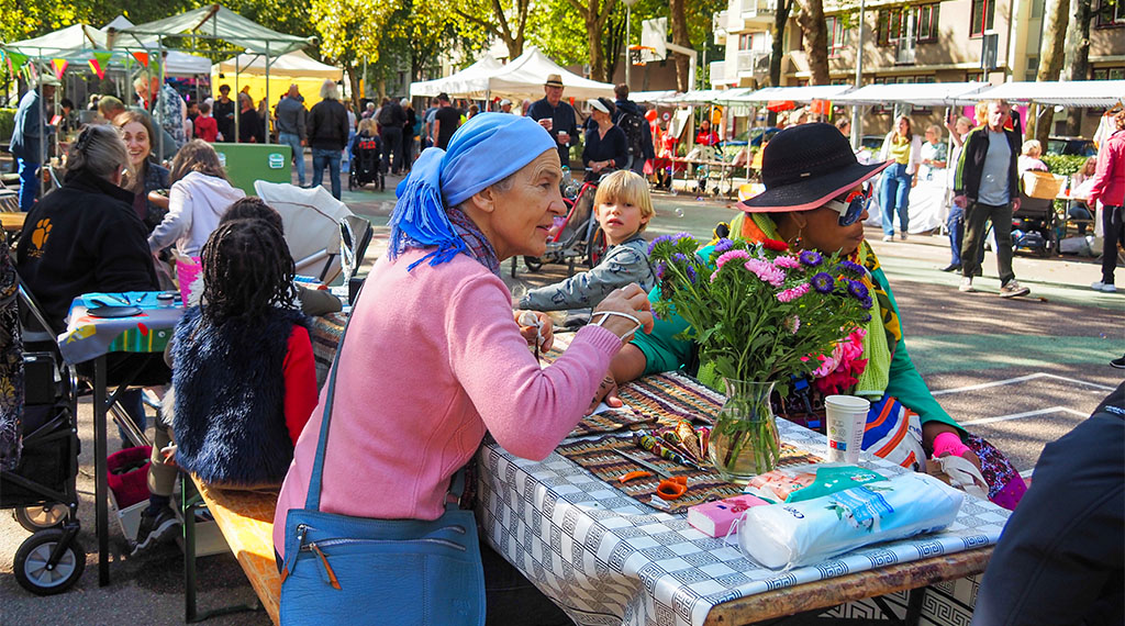 Het feest op het Marie Altelaarplein, achter de Oosterkerk, was van een tot acht gevuld met wel heel veel activiteiten. Rock, rap, Surinaamse band, gospelkoor, films, workshops, zeefmolen, bingo, hapjes uit de wereldkeuken, touwtrekken, gedichten. Te veel plezier om op te noemen…