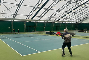 Vrijwel alle tenniswedstrijden vinden plaats in de hal, waar vier banen klaarliggen. ‘Dat is prettig in de winter’, zegt Syno. ‘Maar morgen en overmorgen lijkt het droog. Dan plannen we ook wedstrijden buiten.’ Voor deelnemers levert dat weinig discussie op. ‘Buiten voelt het zelfs warmer dan in de hal’m, lacht Aimee.
